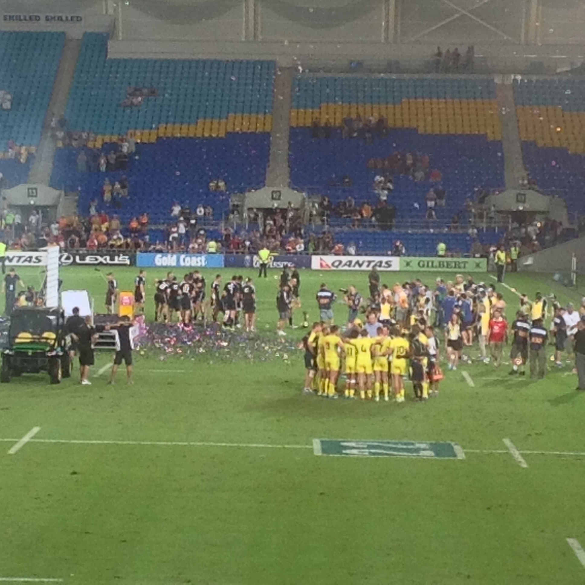 The Gold Coast 7s party is over for 2013 and the Kiwis finally claim the spoils after two exhilarating days of action defeating the Aussies 40-19 in an exciting Cup Final where initially the local team lead 12-0 after two quick tries. All the weekend action was hot on and off the field with the Robina Stadium bathed in glorious sunshine, until the twilight sessions began, of course. The usual costumed spectators from ninja turtles to ostrich jockeys were in the crowd to support Round 1 of the HSBC Sevens World Series.