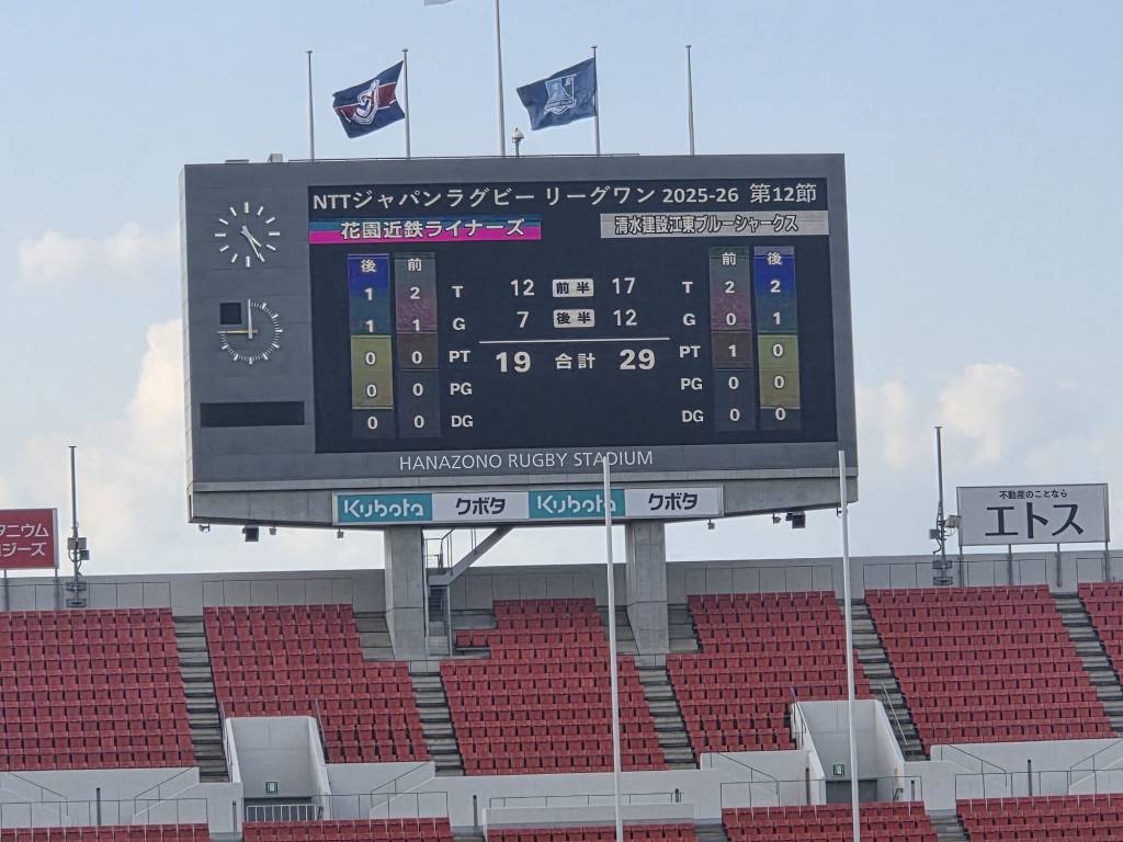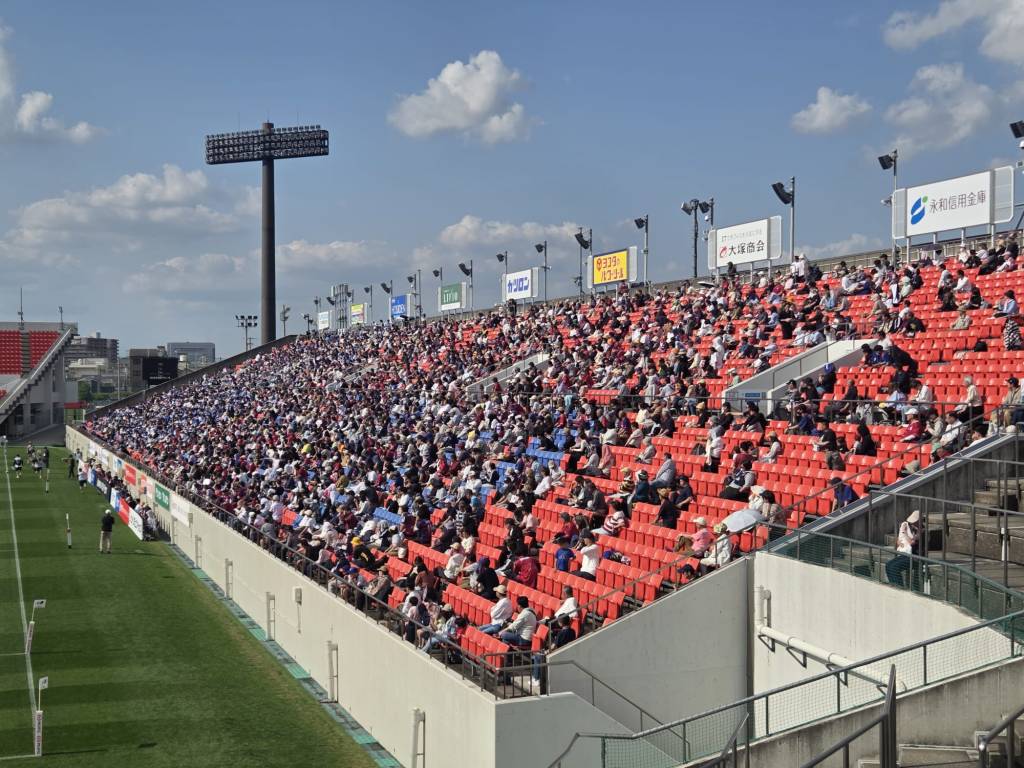 A pleasant 24 degrees Celsius on Saturday and largely blue skies, after a few rainy days during the week, saw the locals turn out in force for this Japanese Div. 2 match between 1 and 3 on the table. What was supposed to be a walk in the park for the local Kintetsu Liners certainly looked that way when they ran in the first try. With Springbok legend, five-eight Manie Libbok, at the helm, the Liners looked every bit why they were the Top of Div. 2 and regained their status in Japan League One. However, the Shimizu Koto Blue Sharks were not going to give up without a fight. Their half of the East Stand in blue (see photo below) became vocal as they started scoring points. Rugby in Japan is serious business.